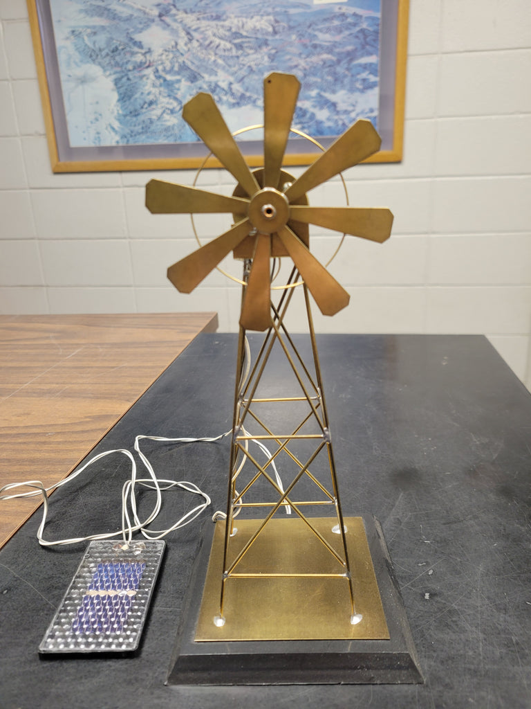 Golden beauty and charm of the spinning blades. Brass on black plastic base with attached solar cell module.
